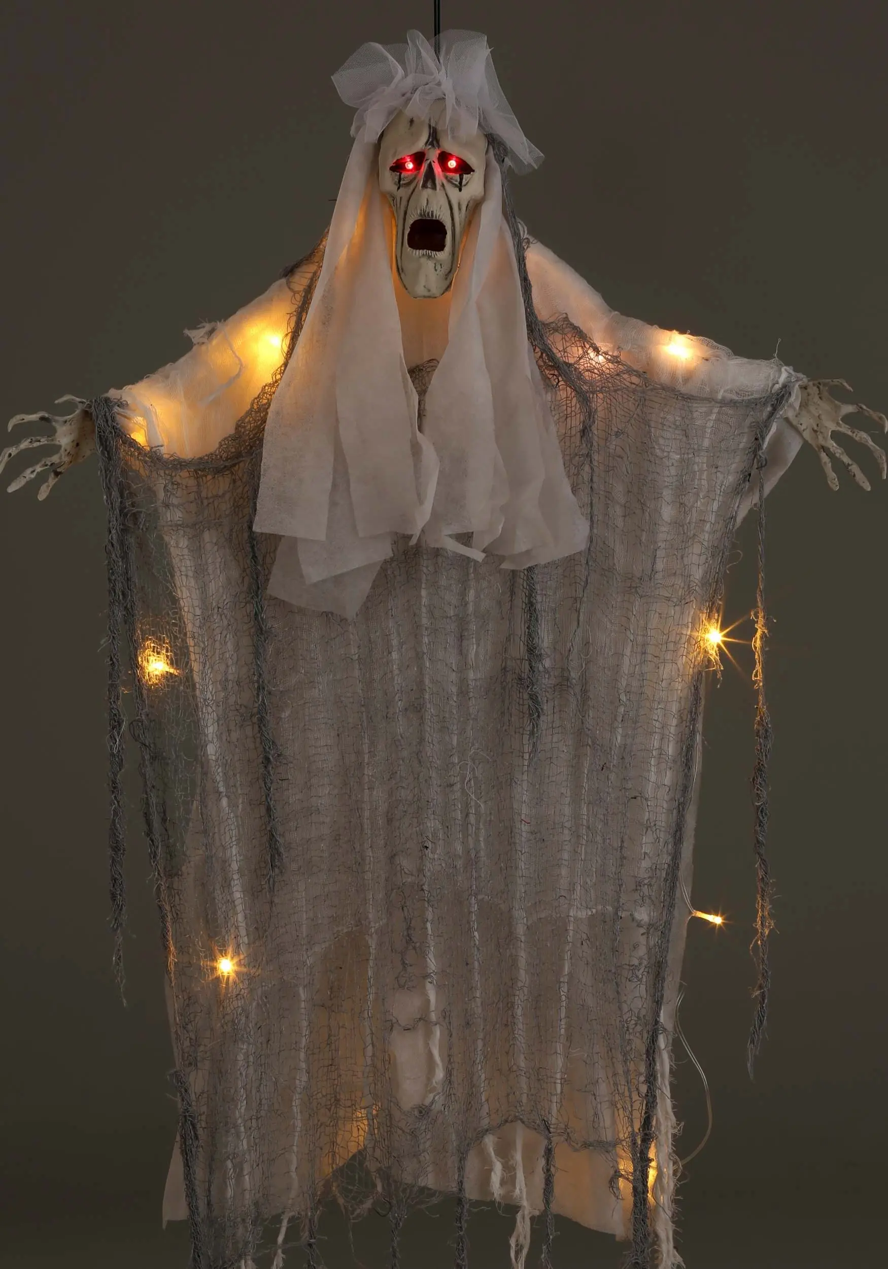 Fortunately, you’ll never get that far into the spooky tale of Halloweens Past. That’s because your future is paved with fun thanks to this Hanging Light-Up Ghost decoration! This creepy haunt will hover wherever you place it thanks to the loop at the head. The look of a haunted shroud is created with tattered layers of cloth and a moaning ghastly face is created from molded plastic. Turn on the power to give your guests the fright of two glowing red eyes, too! This piece of Halloween decor will be legendary!Â
