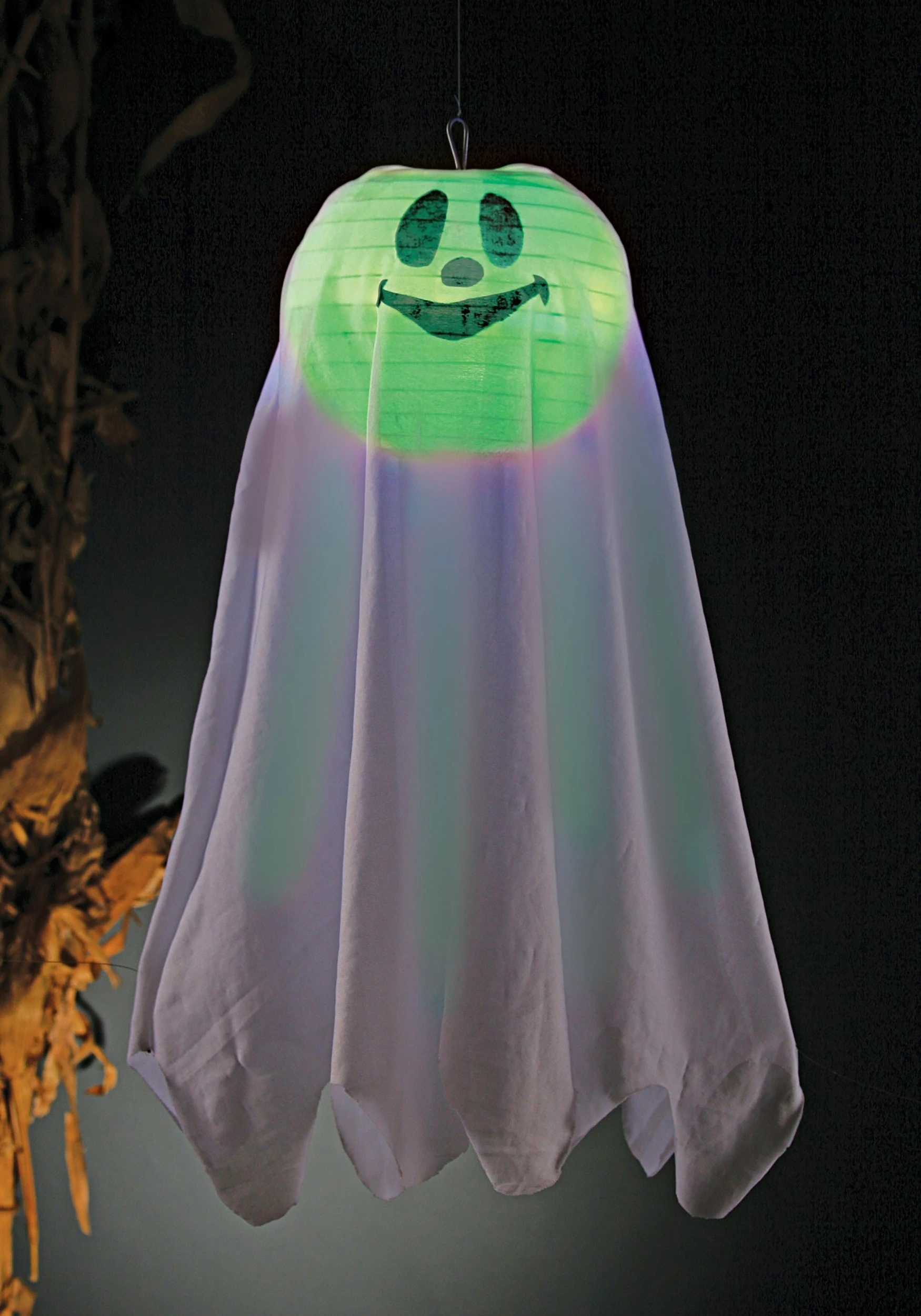 This decoration comes with an 18-inch printed fabric ghost, a hanging frame, a 6-inch color-changing LED lantern and 3-LR44 batteries. Once assembled, hit the on/off switch and the ghost will start glowing and changing color from blue to green to red.Â