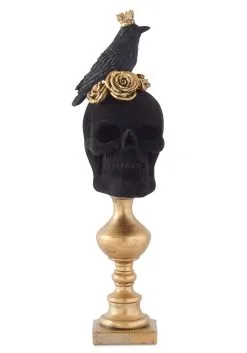 There’s no reason why you can’t be scary and fabulous! This 16 Inch Black Velvet Skull with Roses will look perfect as a centerpiece at your Halloween celebrations. The gold-tone pillar supports a black skull wearing a wreath of gold fabric roses. A faux raven wearing a crown perches on top.