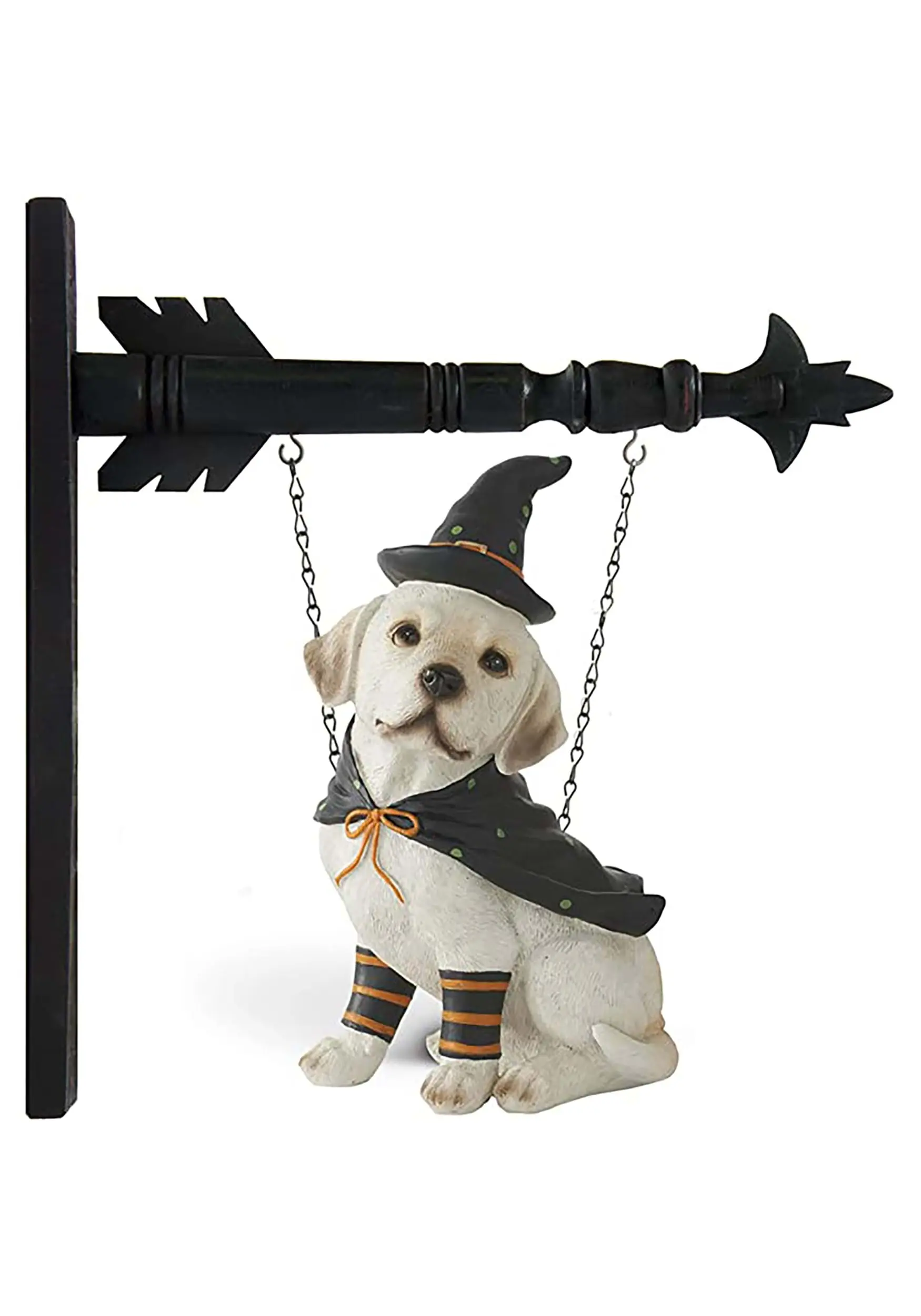 Is this a puppy with a knack for magic, or a witch who turned herself into an adorable creature? Doesn’t matter, because it makes the cutest Halloween decoration ever! This Dog with Witch Hat 11.5″ Figure features a sweet, white-furred puppy with floppy ears and a soulful expression. It wears orange-and-black-striped legwarmers, a black cloak tied with an orange ribbon, and a black witch’s hat. Two chains attached to the pup’s shoulders allow you to hang it from a standard arrow mount. Most witches are scary, but you’ll want to give this one a scratch behind the ears!