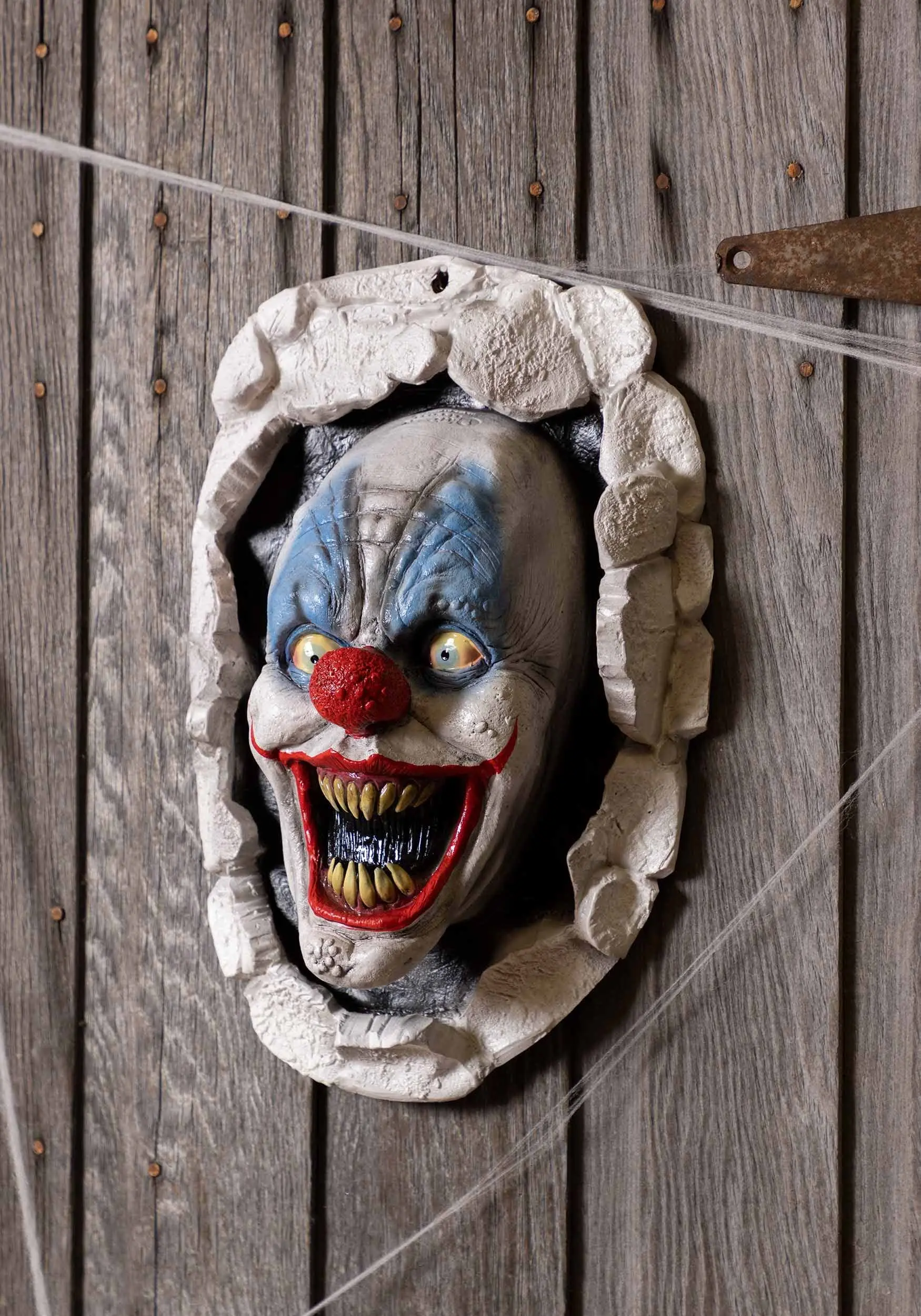This Clown Wall Halloween Decoration looks like it’s asking to come in – don’t let it! The molded decoration can be attached to a flat surface to make it look as though a crazy-eyed clown with businesslike fangs has just busted through your drywall.