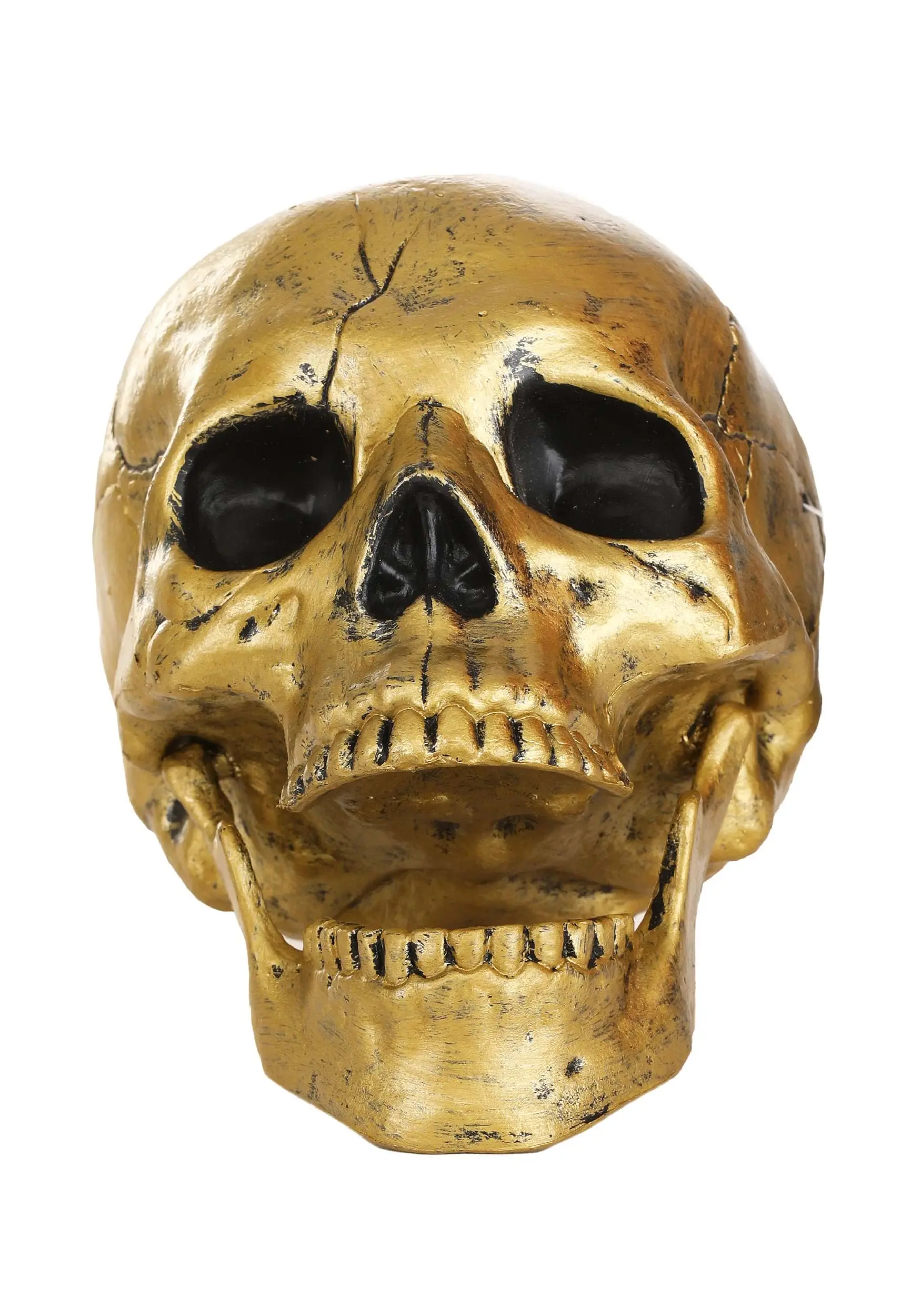 This skull is made of molded plastic. It is painted gold and black. It stands right around 6inches tall. The jaw of this skull is designed to open and shut. So you will be able to position this decoration however you see fit, shut tight with a sinsiter smile or open wide while manically laughing.