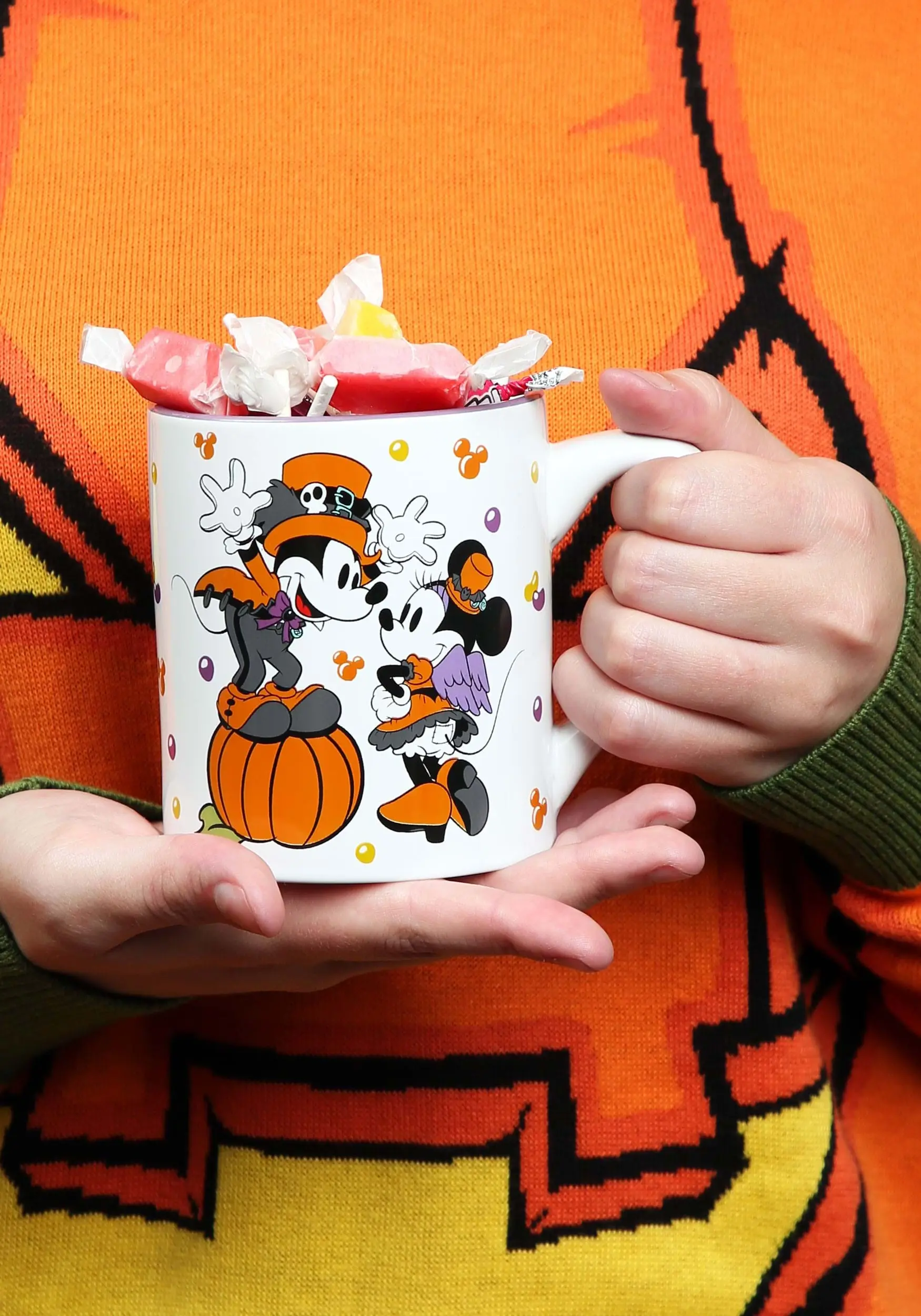 Celebrate a great Halloween with this Mickey and Minnie Let’s Party Disney Halloween mug! It features our favorite Disney mouse couple all dressed up and ready to dance. It will hold 14 ounces of your favorite beverage, hot or cold. If you forget about your coffee or tea after you make it (like many of us do), you can even stick it in the microwave to reheat your drink. And, since it’s dishwasher safe, it’s easy to clean as well. It’s the perfect mug to keep you in the Halloween mood whenever you decide to use it!