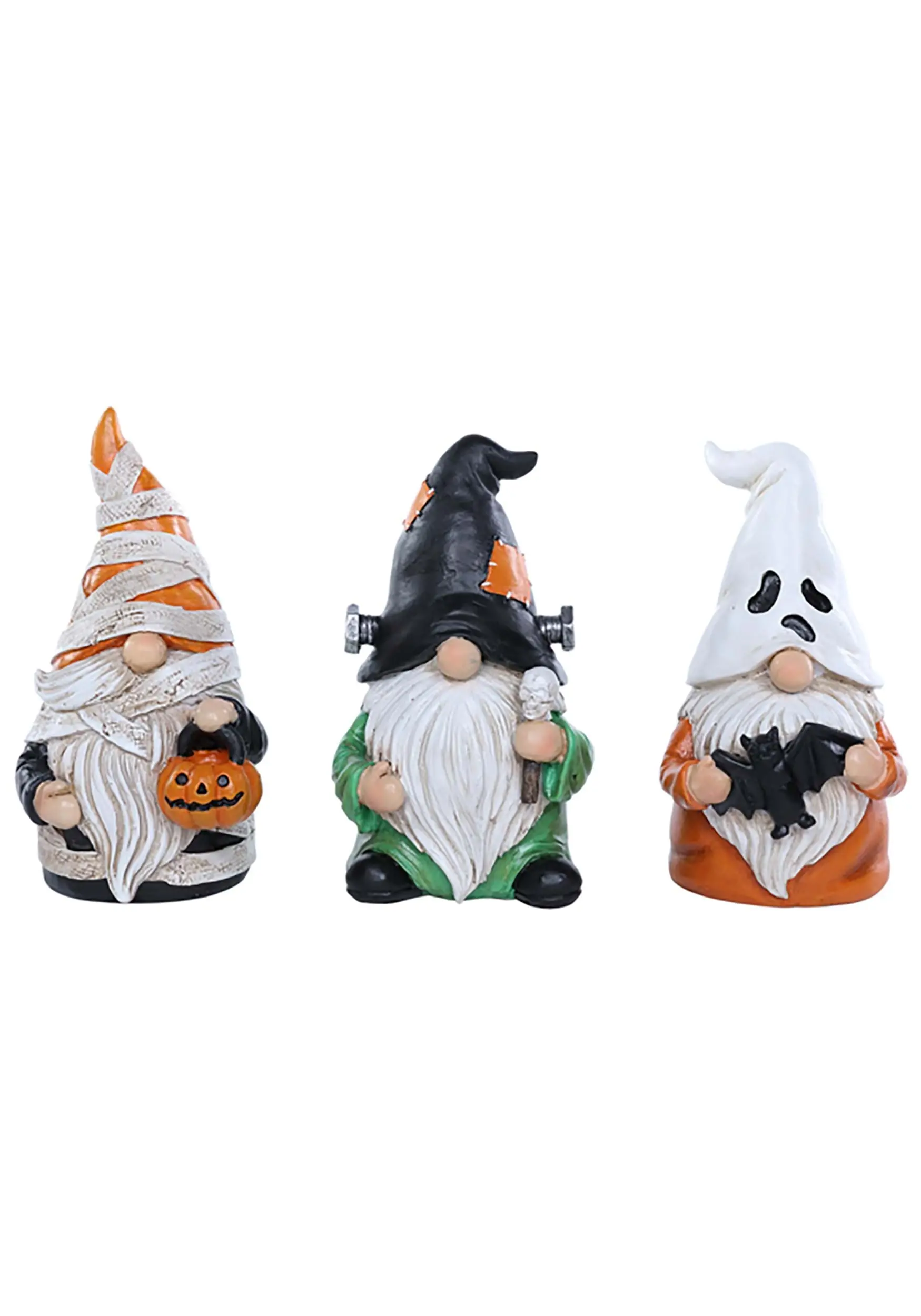 Liven up your holiday decorations with this 6″ Halloween Set of 3 Resin Gnomes Decoration! The sweet trio have the classic full gnome beards and nose peeking out from beneath their hats. They’re dressed in mummy wrappings, Frankenstein bolts, and ghost sheets respectively.