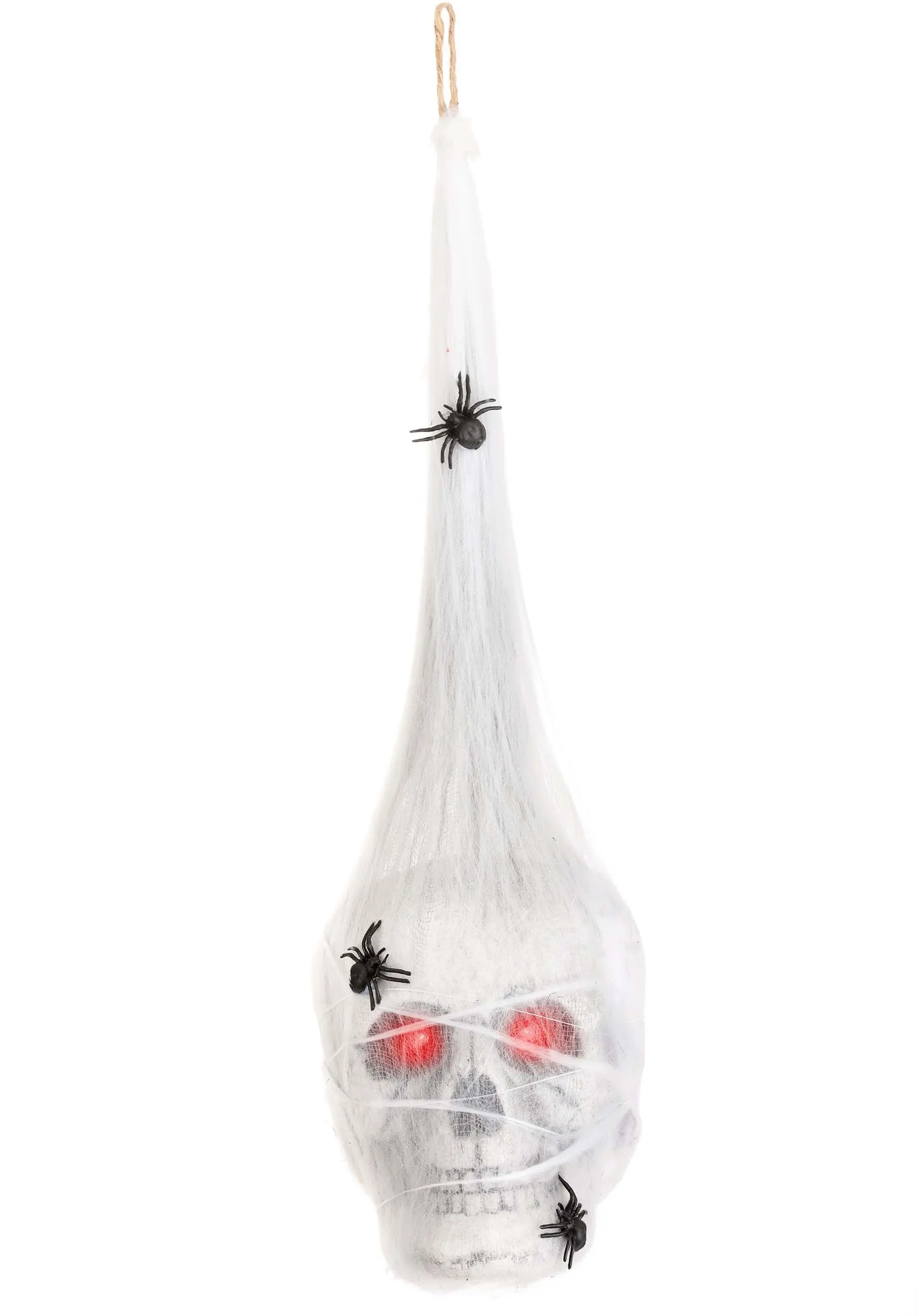 Set a truly frightening scene with this exclusive Cocoon Skull w/Red Light! The realistic skull is made of molded styrofoam and fitted with red bulbs in its eye sockets. When activated, the eyes will glow red and slowly flash on and off. The skull is encased in a spiderweb-esque netting festooned with plastic spiders. It ends in a loop for hanging.Â
