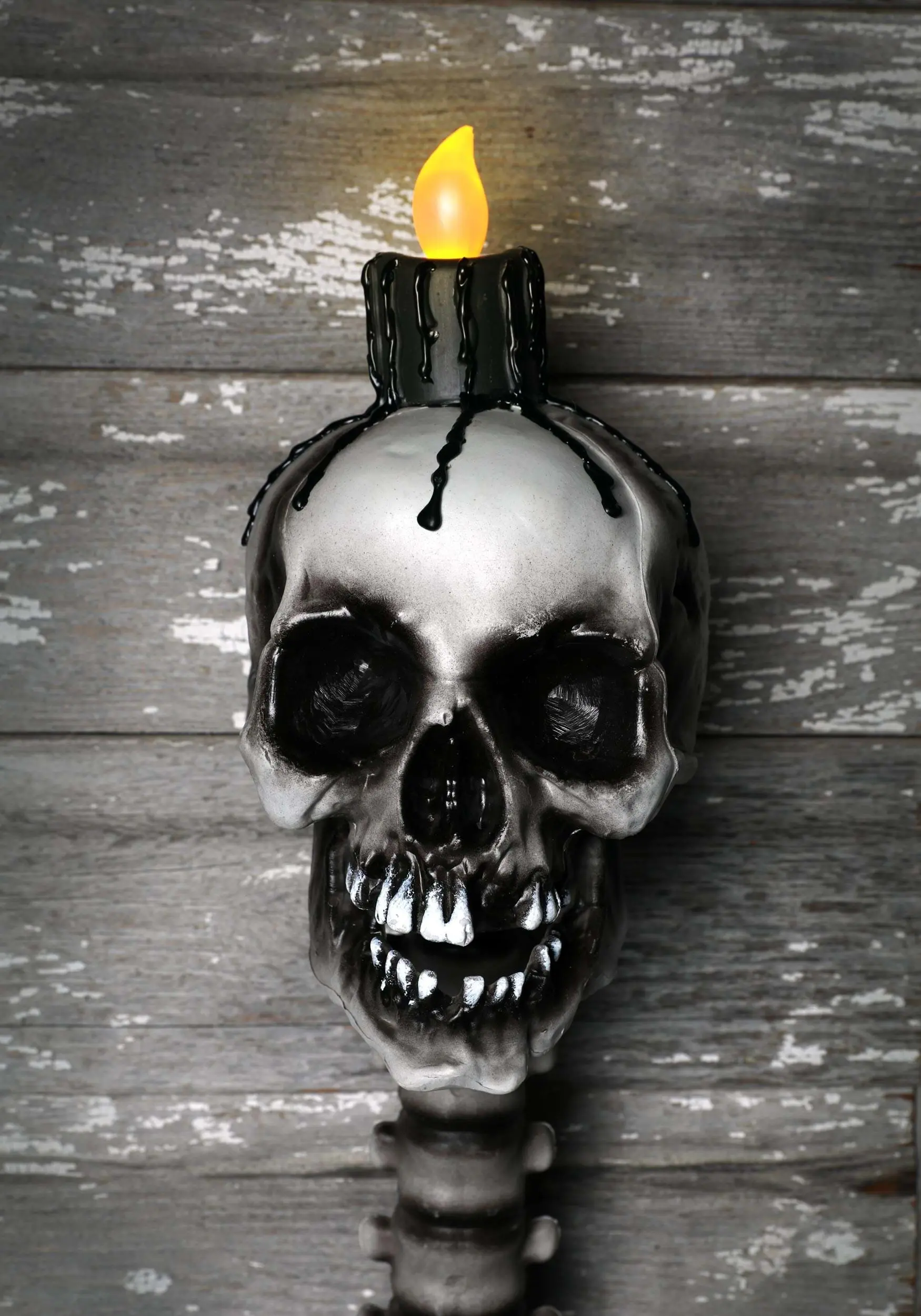 You won’t find another fixture as fearsome as this! That’s because this exclusive decoration was crafted in-house but our wickedly talented designers. It’s a skull with long neck vertebrae that mounts to the wall, while a “candle” sits atop the head and black melted wax “drips” down. Happy Haunting!