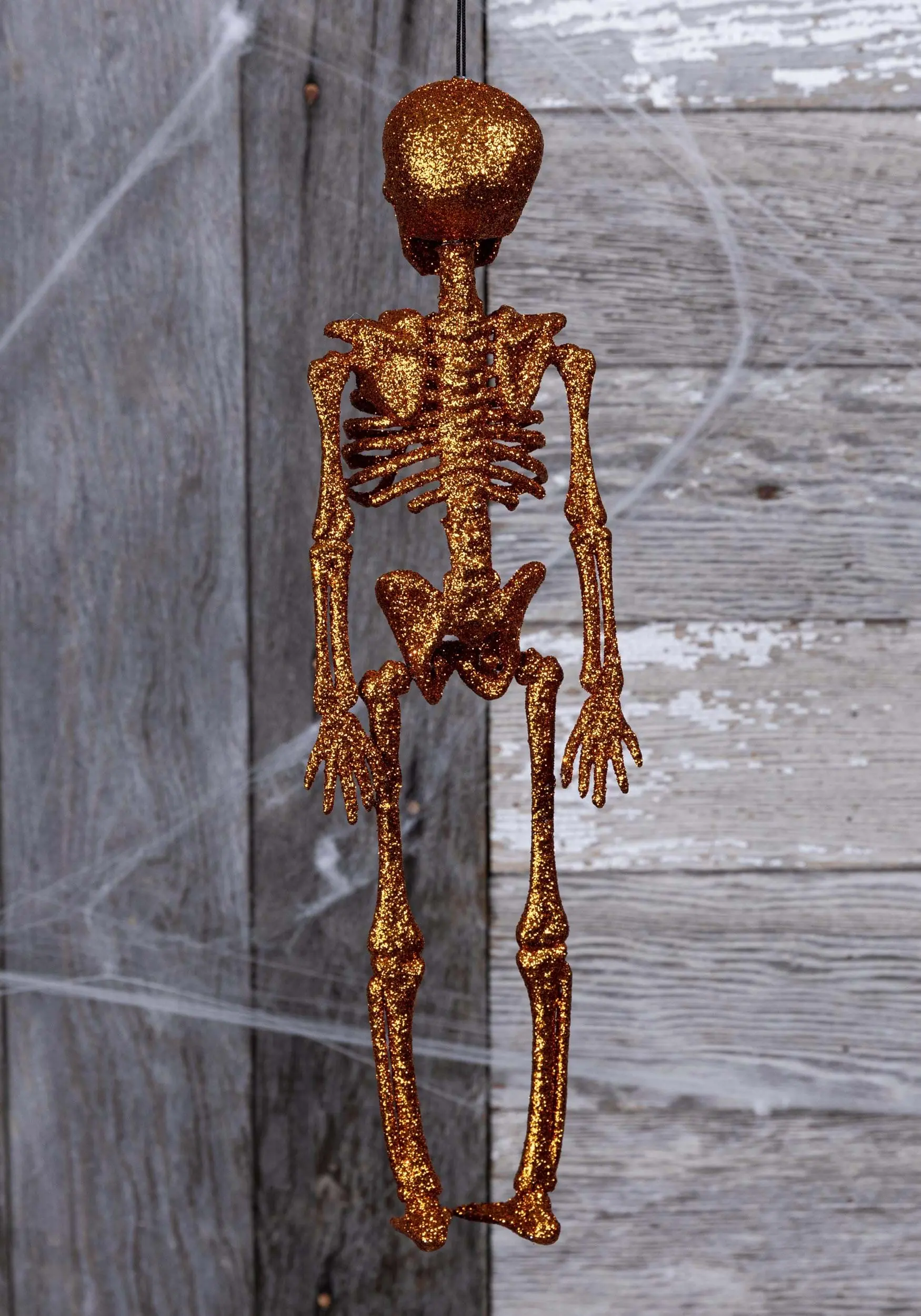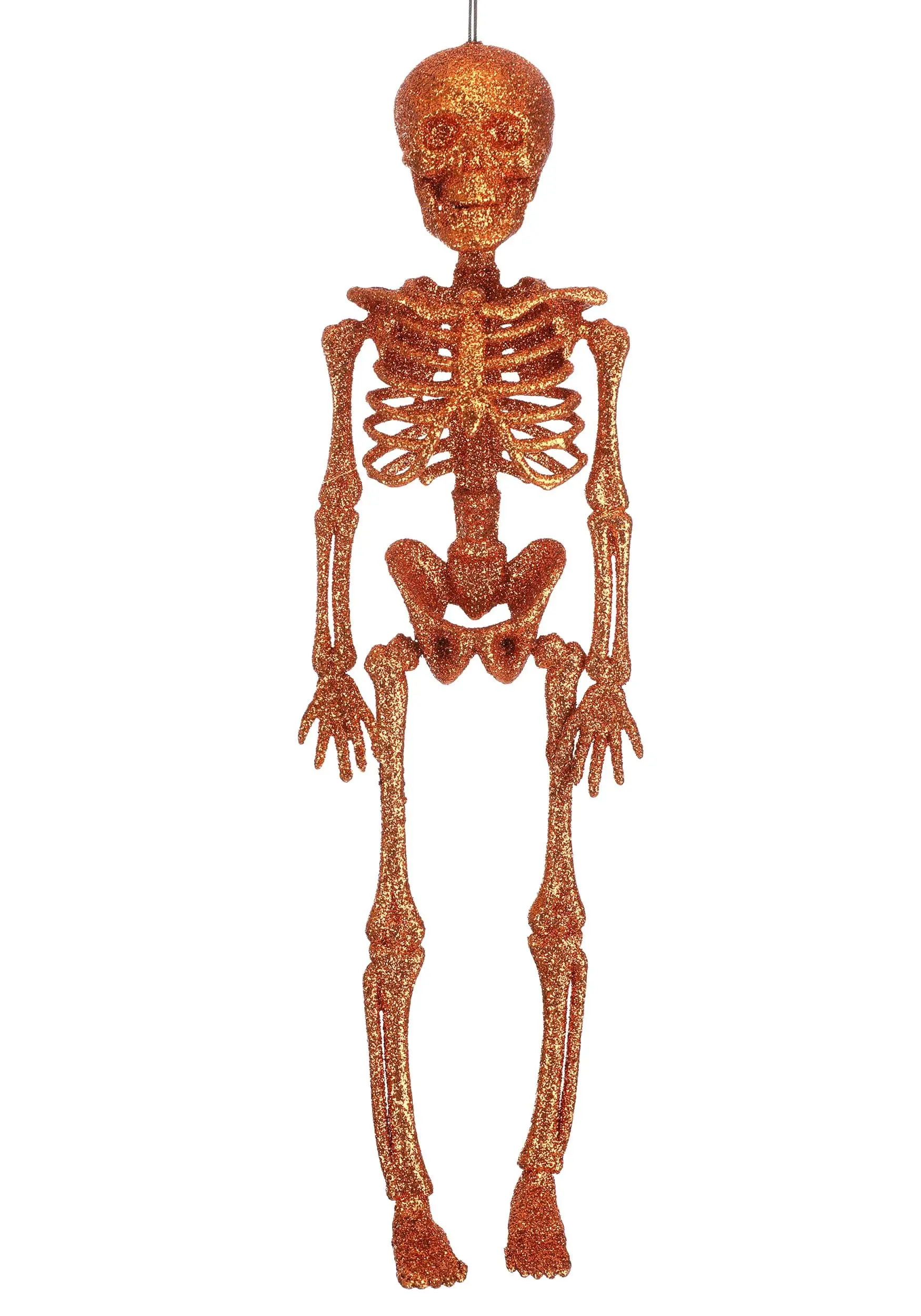 No glowing jack o’ lantern has ever looked as fancy as this exclusive Orange Glittering Skeleton! The molded plastic skeleton is approximately sixteen inches tall and is completely covered with sparkly orange glitter. Its jaw, neck and hips are all articulated. A cord loop is attached to the skull for hanging purposes.