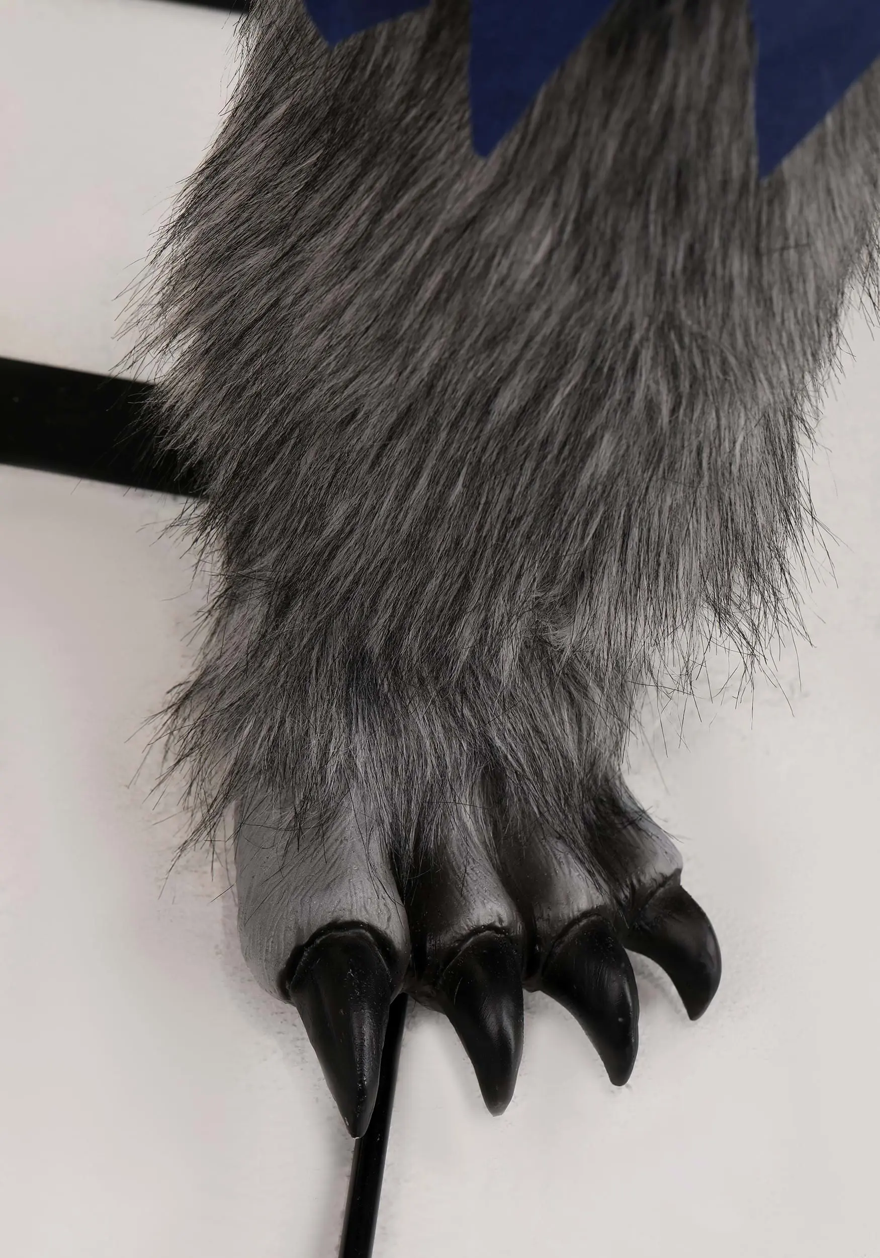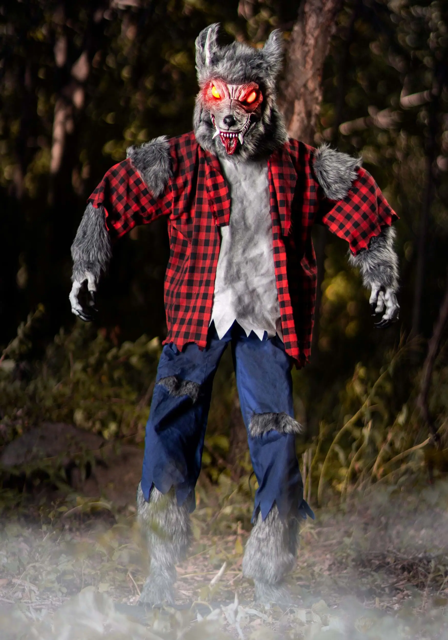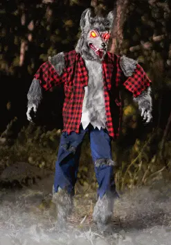 Thrills and chills abound when you set up this exclusive Classic Animated Werewolf Halloween Decoration in your home, yard, or haunted attraction! The life-sized figure is covered with gray faux fur and wears a slashed plaid shirt over a distressed white undershirt and ripped blue pants. When activated, its eyes glow in its snarling face, its head moves back and forth to track its victims, and it plays fearsome pre-recorded sound effects!Â